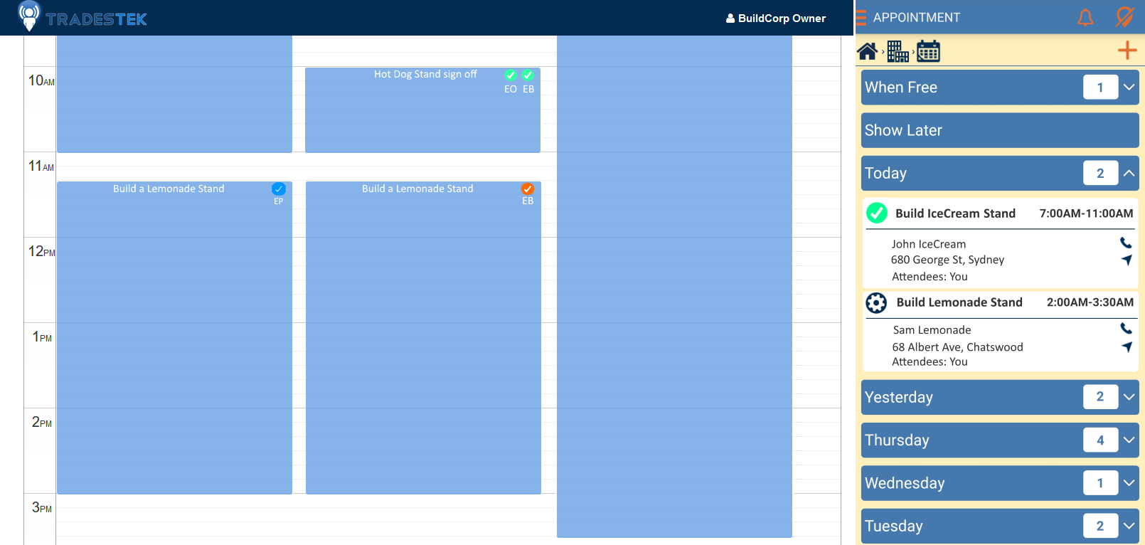 See all your appointments in a live Calendar which is colour coded by the actual status of all your appointments for the day or week. Simply click on any to go to the full appointment or project details screen to learn more.