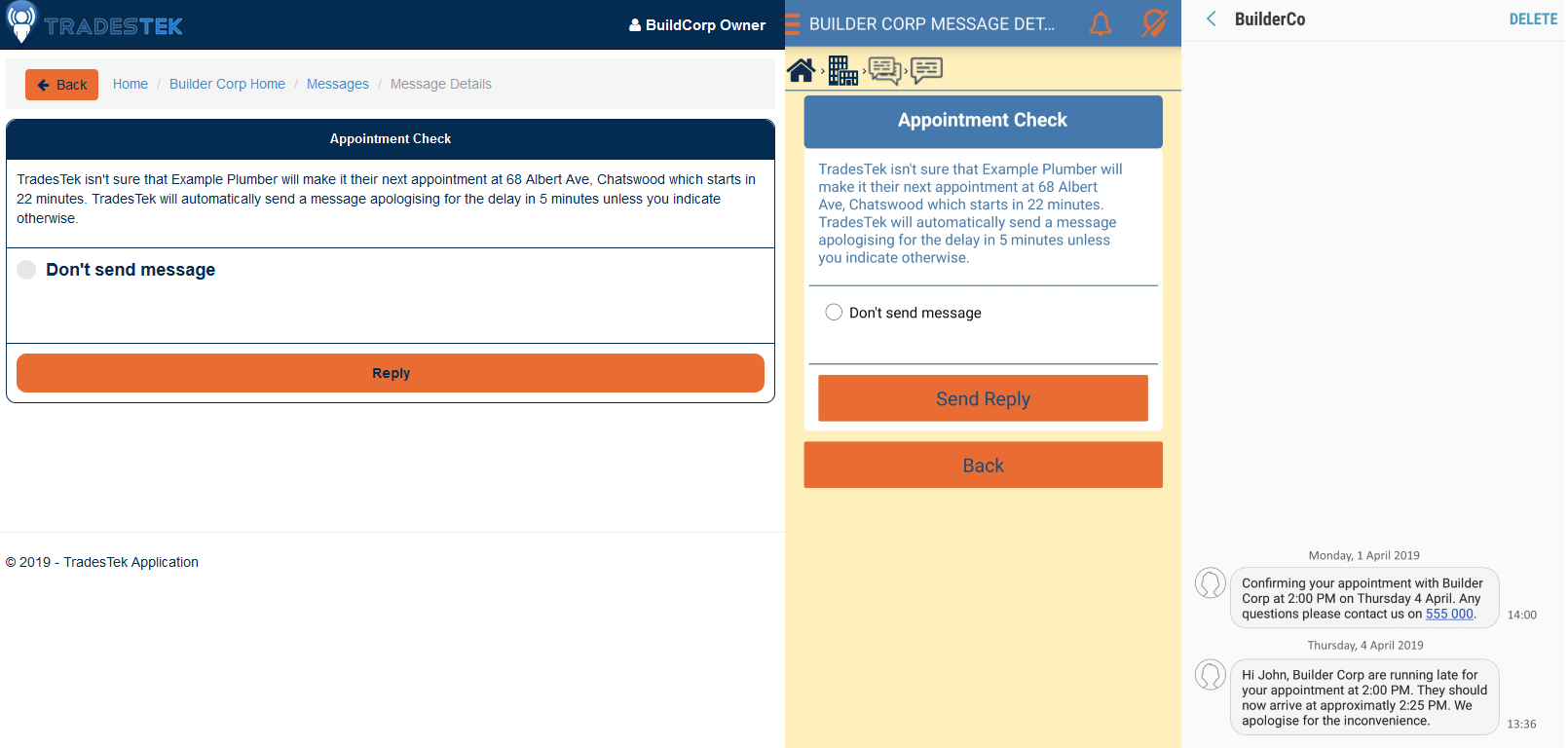 There is no to stop to call or text the customer when you are running late as TradesTek will detect this for you and send them an apology message along with a new ETA based on how far away you are and current traffic conditions – of course it always gives you a chance handle the situation personally first.