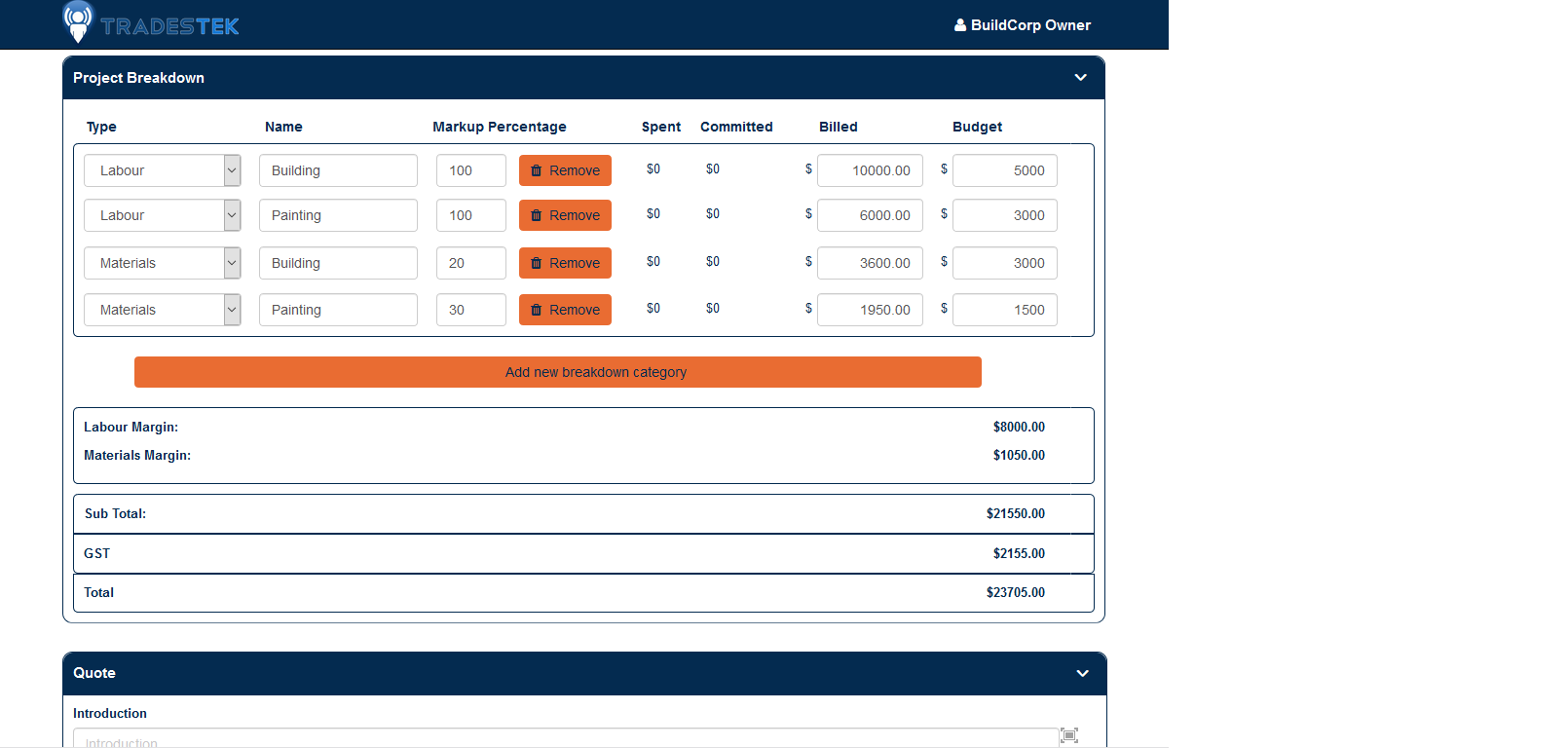 Simply create “Buckets” within the budget for each different category and task like Painting Materials of Building Labour – enter the margin you want and your estimate for the billed or budget amount and TradesTek will calculate the rest.