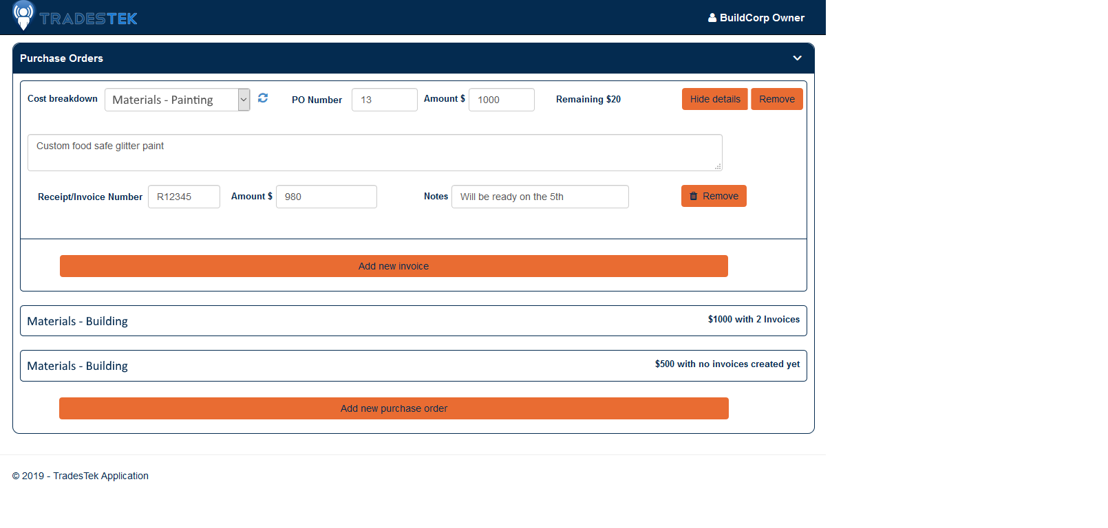 Keep your purchase orders with the project, so your workers can easily find them when needed without having to call back to the admin staff.