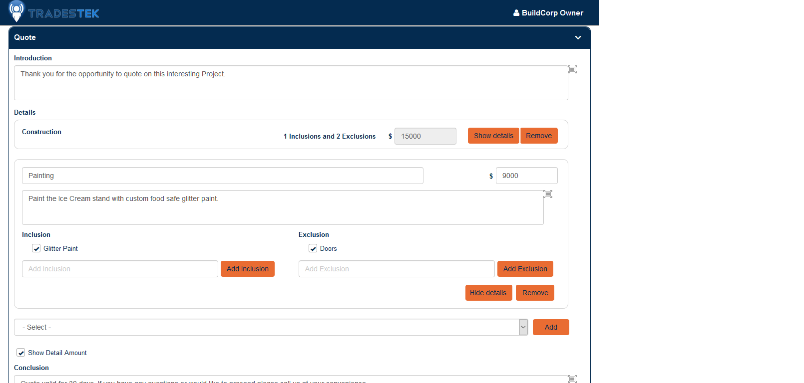 Create your own templates for different jobs. These contain a standard description and inclusions/exclusions which are common to note for that job which can then be ticked onto the quote or not. This helps prevent accidentally forgetting to note that the quote doesn’t cover a part of the job and then having to do that at your own expense.