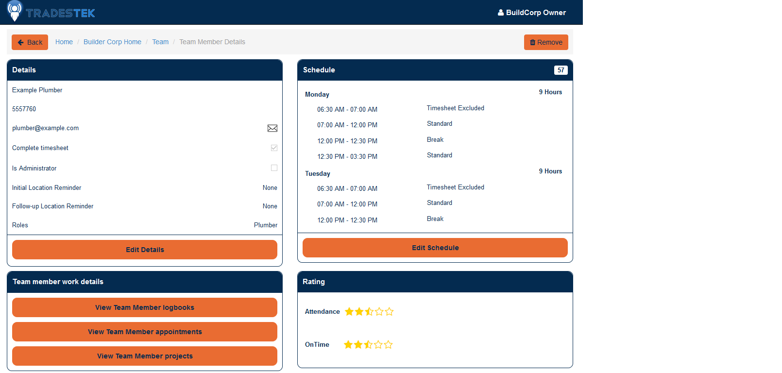 Maintain your staff details like which roles they can be assigned to, their working schedule and set the configuration options to get the most out of TradesTek.
